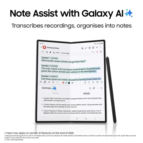 Take your notes to the next level with Note Assist3 on Galaxy Z Fold6. Unfold for a tablet-sized screen and easily take meeting or lecture notes on-the-go with an S Pen. You can even take a voice recording in another language and instantly transcribe, translate, summarise and format these recordings into clear, simple-to-review notes for you to revisit later or share with your colleagues.